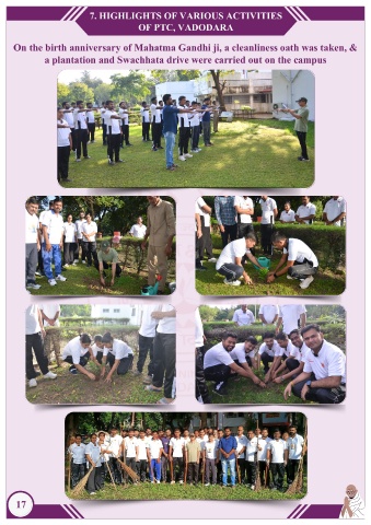 7. HIGHLIGHTS OF VARIOUS ACTIVITIES OF PTC, VADODARA On the birth anniversary of Mahatma Gandhi ji, a cleanliness oath was taken, & a plantation and Swachhata drive were carried out on the campus 17