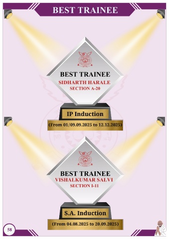 BEST TRAINEE BEST TRAINEE SIDHARTH HARALE SECTION A-20 IP Induction (From 01/09.09.2025 to 12.12.2025) BEST TRAINEE VISHALKUMAR SALVI SECTION I-11 S.A. Induction (From 04.08.2025 to 20.09.2025) 58