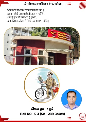 ई-प का डाक श ण क , वडोदरा े े े डाक सवा जन सवा सफ एक नारा नह है , इसका कोई योजना कसी स हारा नह है , े े ध ह हम जो कमचार ह इसक , डाक िवभाग जीवन है सफ एक सहारा नह है | ु द पक कमार कर ु Roll NO- K-3 (SA - 239 Batch) 48