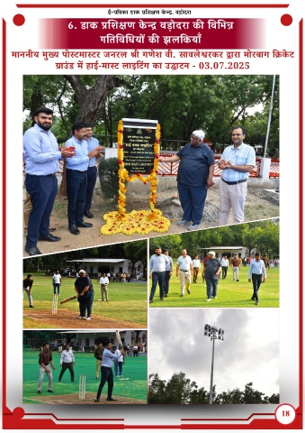 ई-प का डाक प्र शक्षण क े न्द्, वड़ोदरा 6. डाक प्र शक्षण कन्द् वड़ोदरा क व भन्न े ग त व धय क झल कया ँ माननीय मुख्य पोस्टमास्टर जनरल ी गणेश वी. सावलेश्वरकर ारा मोरबाग क े ट ाउड म हाइ-मास्ट लाइ टग का उ ाटन - 03.07.2025 ं 18