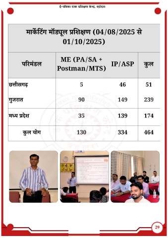 ई-प का डाक प्र शक्षण क े न्द्, वड़ोदरा माक टग मॉ ूल प्र शक्षण (04/08/2025 से 01/10/2025) ME (PA/SA + ं प रमडल IP/ASP क ु ल Postman/MTS) छ ीसगढ़ 5 46 51 गुजरात 90 149 239 मध्य प्रदेश 35 139 174 क ु ल योग 130 334 464 29